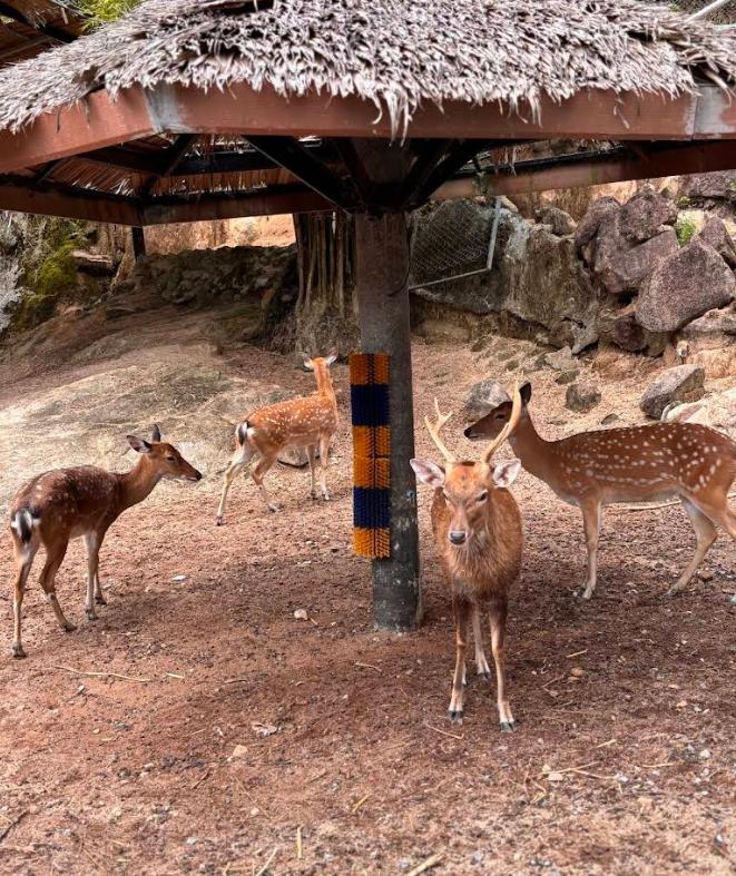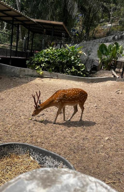 At the entrance you can buy a basket of food for 100 baht, and that instantly turns the visit into a playful adventure. Children can feed tortoises, pet rabbits, hold hedgehogs, offer treats to deer and even feed fish from a small bottle. A talking parrot often steals the show — a little moment everyone remembers.