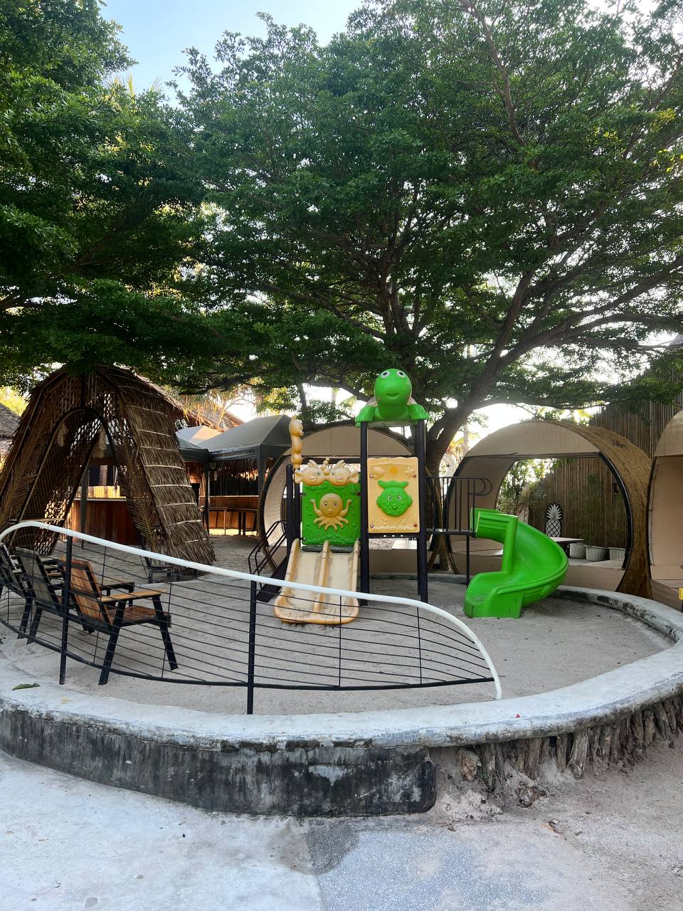 Рядом есть небольшая детская площадка, поэтому сюда удобно приходить семьями: младшие играют на горках и качелях, пока старшие пробуют фигуры на скейтплощадке. Формат максимально простой: бери свою доску, воду и желаемую защиту — и у тебя есть уголок урбан-энергии посреди тропического Пангана.