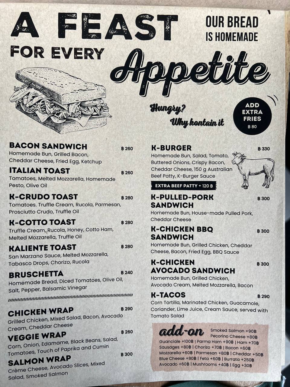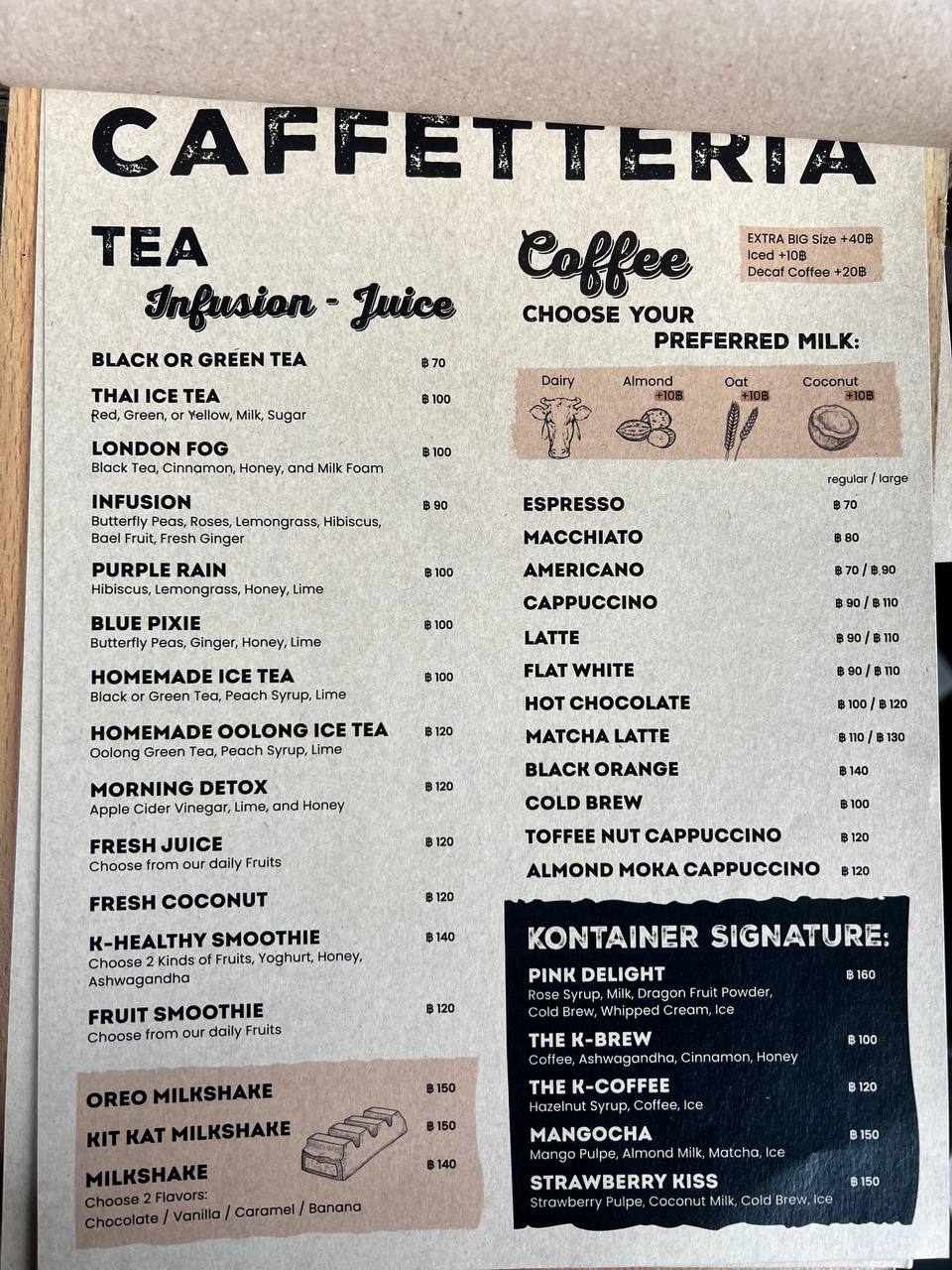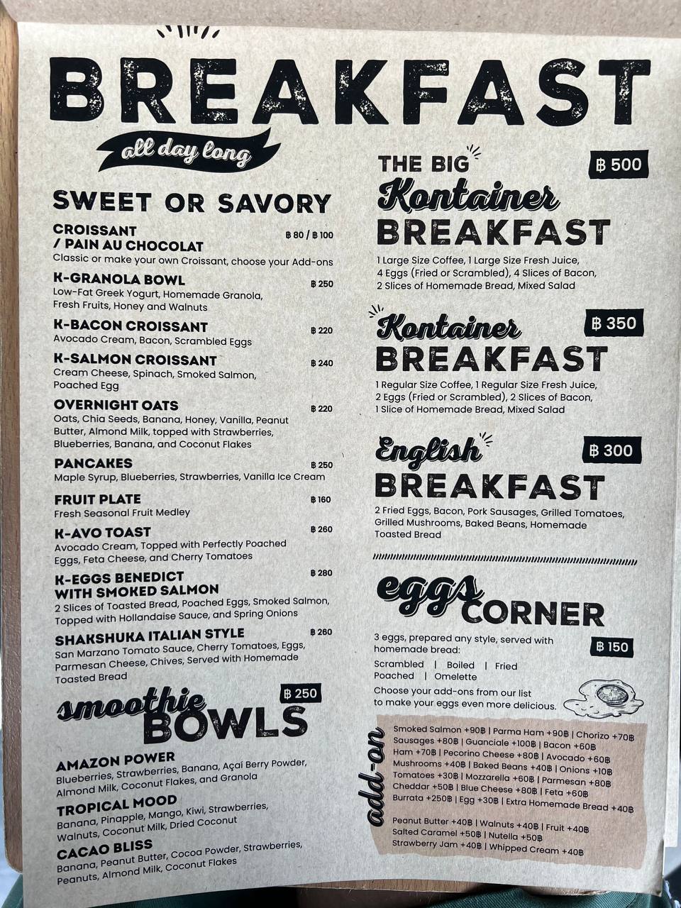Особенно хвалят завтраки: яичницу-болтунью, яйца Бенедикт, круассан с авокадо, итальянские тосты и фирменный завтрак «Kontainer». Всё подают аккуратно, с правильной температурой и без лишней суеты. Кофе — стабильно отличный, с возможностью выбрать альтернативное молоко (например, овсяное).