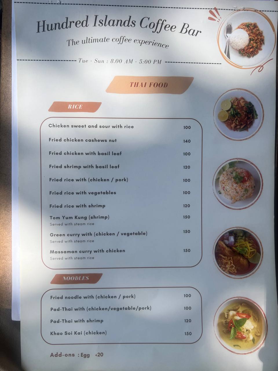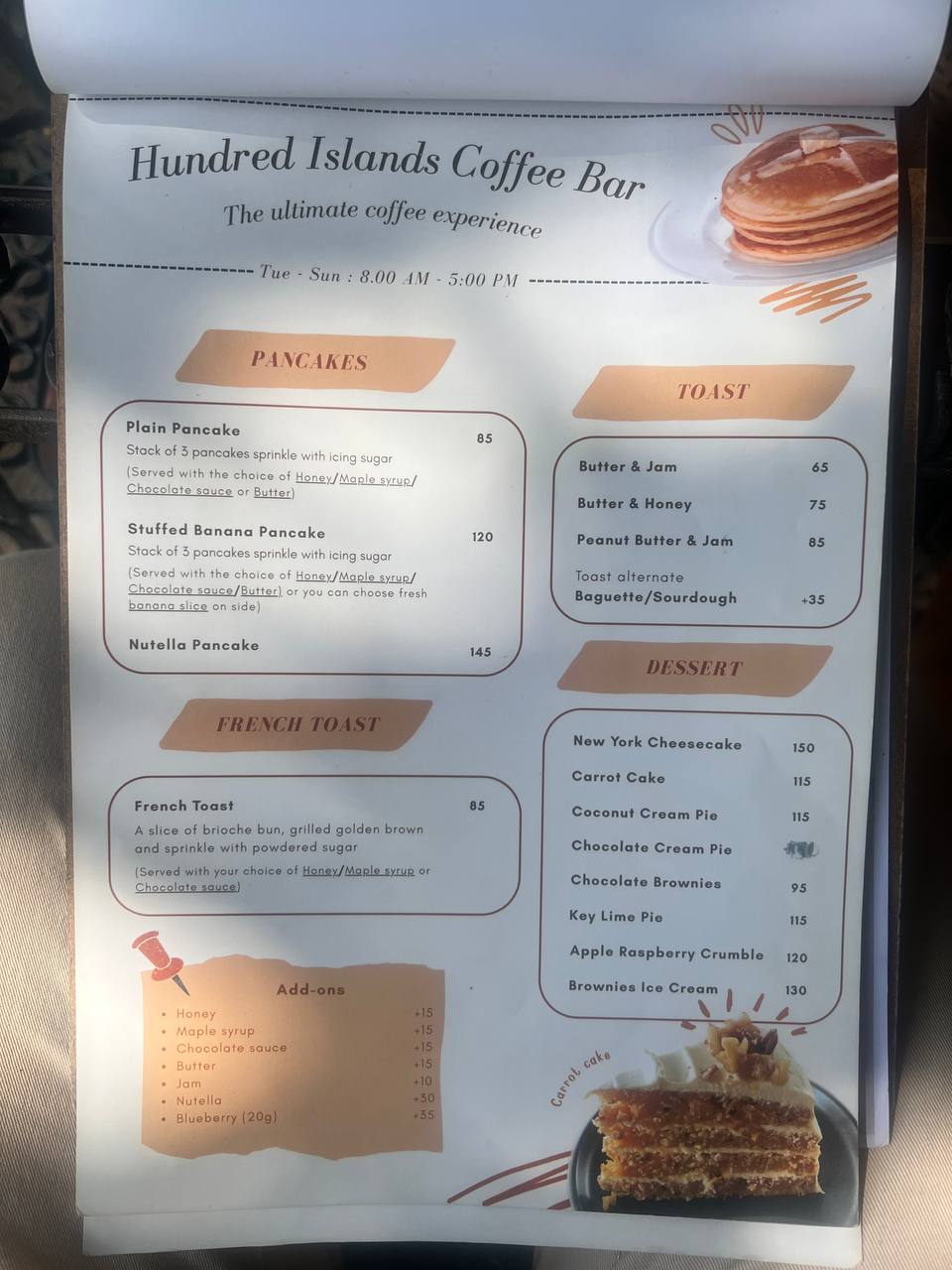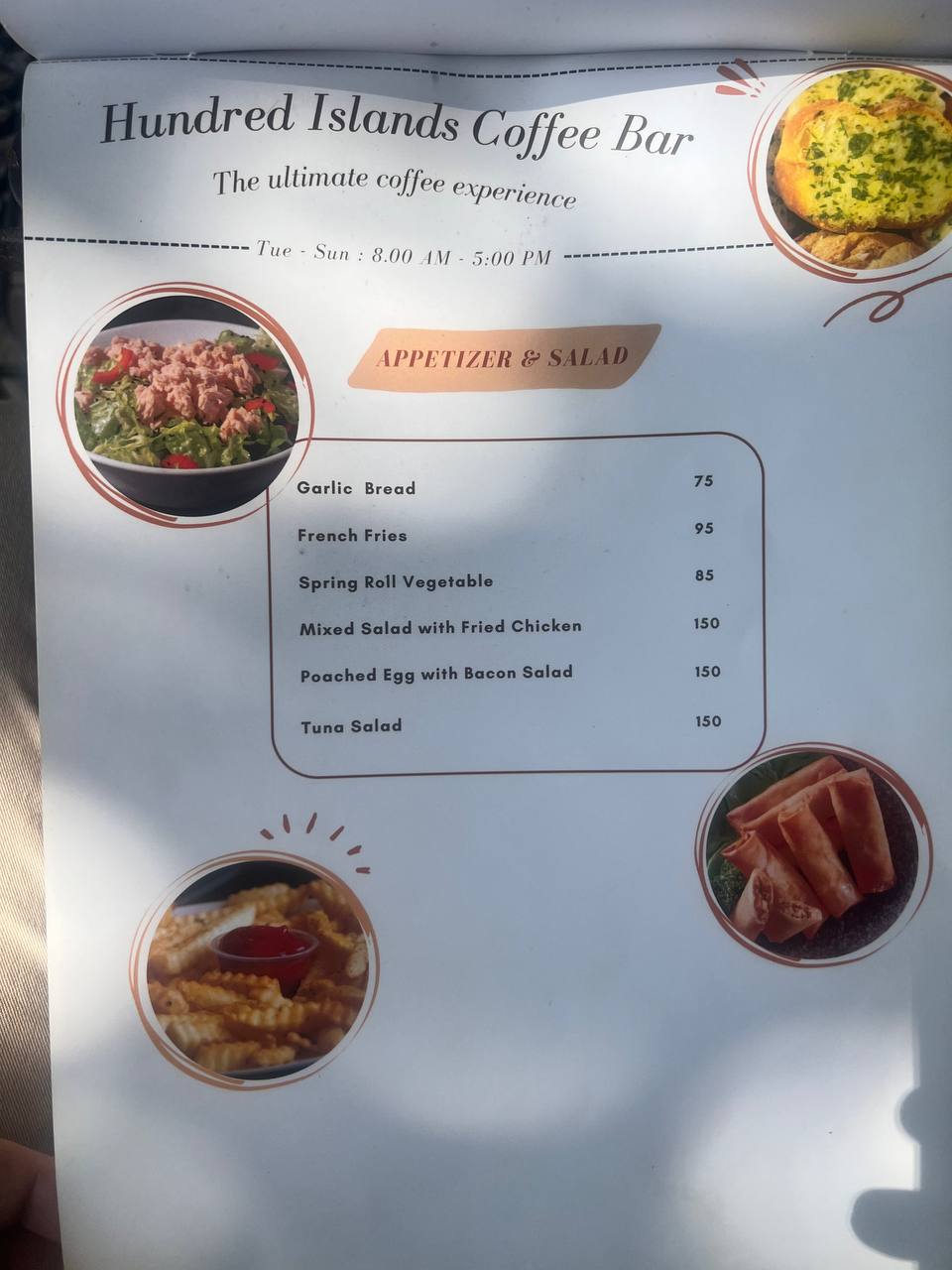 Спрятанное рядом с дорогой, но удивительно спокойное, кафе Hundred Islands Coffee Bar предлагает тёплую и гостеприимную атмосферу, идеально подходящую для расслабляющего перерыва. Известное внимательным персоналом и доступными ценами, это кафе стало любимым как у местных, так и у гостей острова.