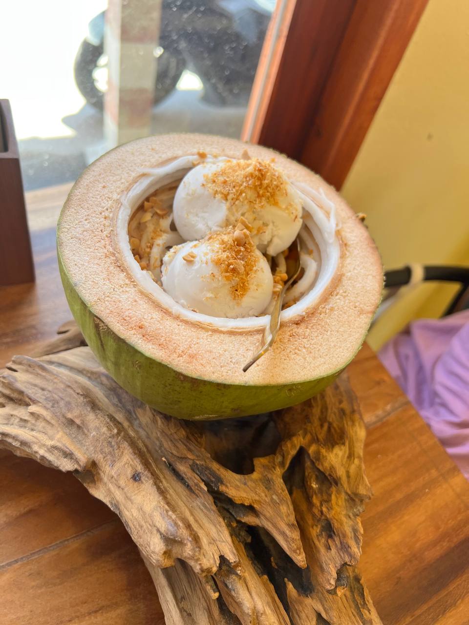 Отдельного внимания заслуживают десерты: брауни с шоколадным соусом и домашнее кокосовое мороженое, которое не только вкусное, но и красиво подано. Также здесь можно попробовать разнообразные смузи, включая опции для тех, кто не переносит лактозу.