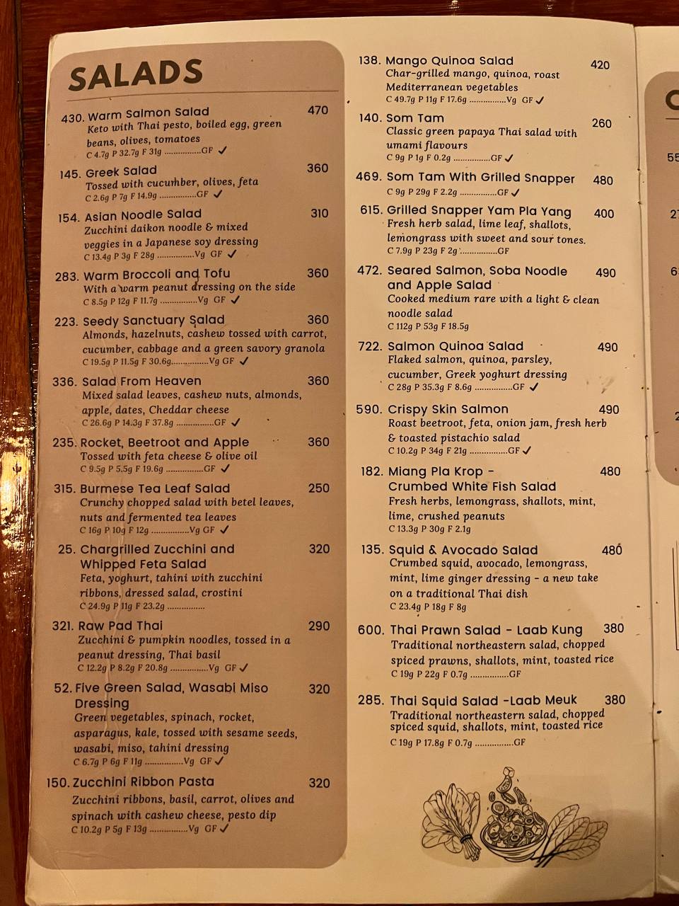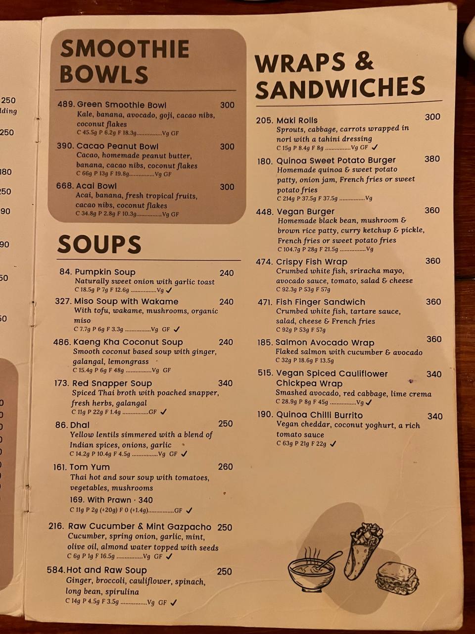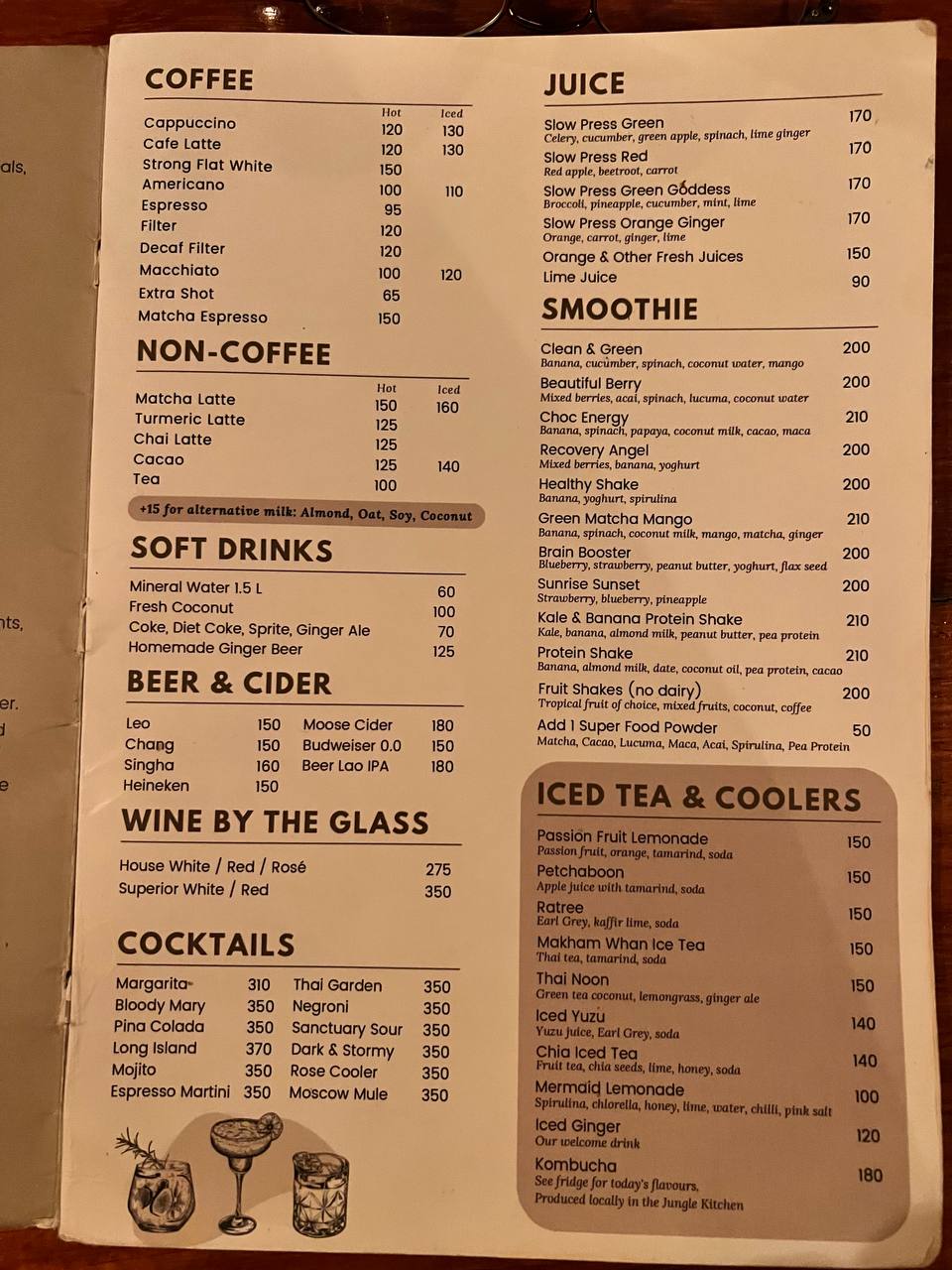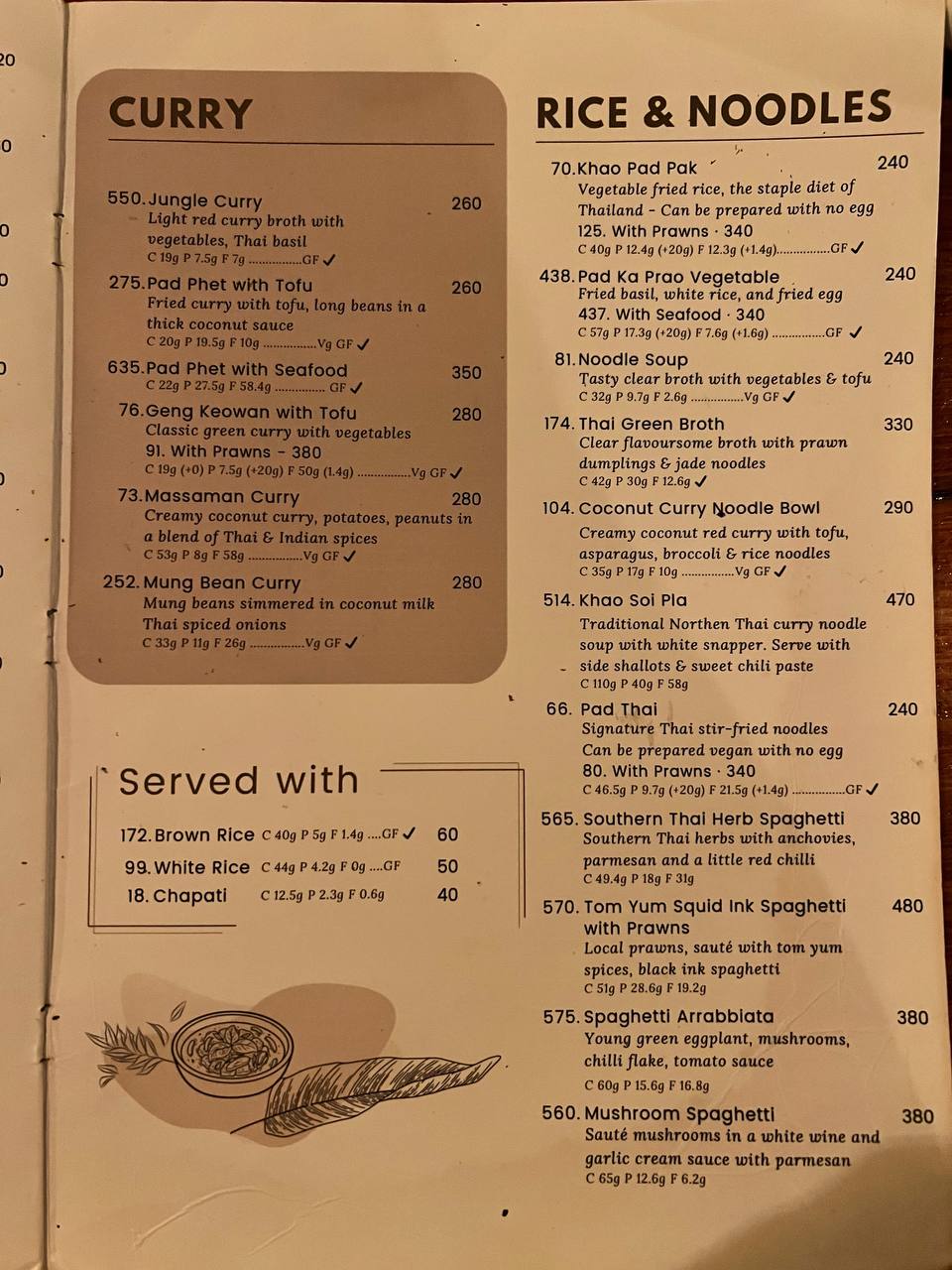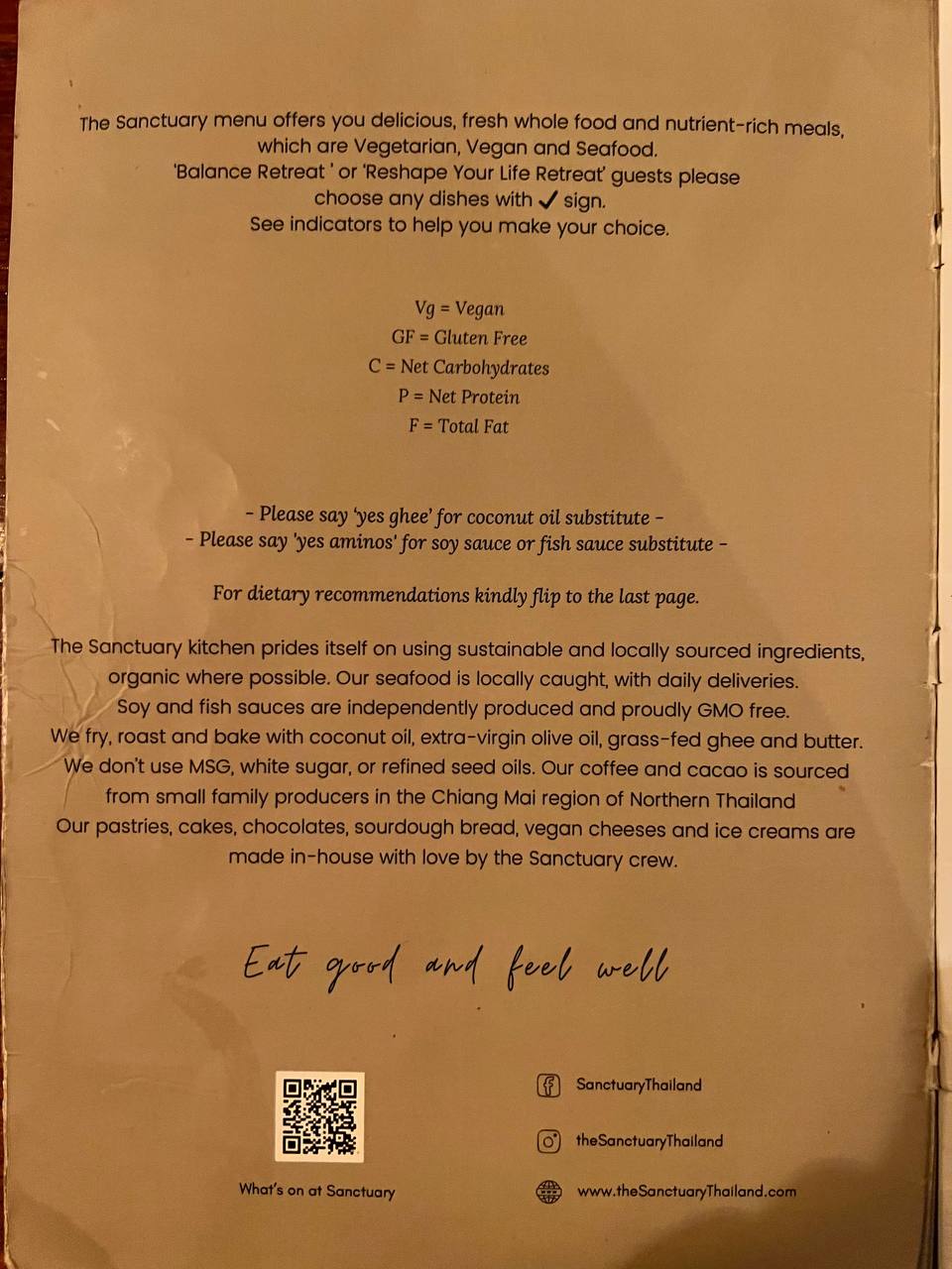 В меню нет рафинированного сахара, глутамата и переработанных масел. Используются кокосовое масло, оливковое extra virgin, ги и масло из травяного откорма. Морепродукты поступают от местных поставщиков, а кофе и какао — от фермеров северного Таиланда.
